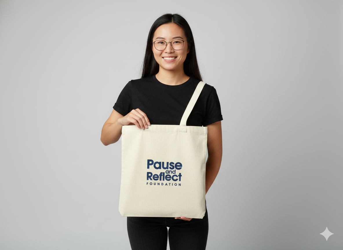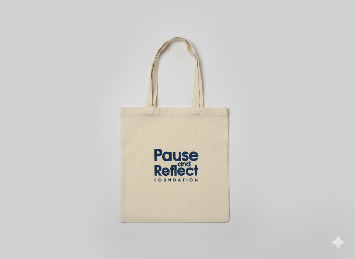 Reusable cotton canvas tote bag featuring the Pause and Reflect Foundation blue logo. This lightweight, unisex tote is designed for everyday use including shopping, events, errands, and promotional distribution. Constructed from durable plain-weave cotton canvas with dual shoulder straps for comfortable carrying. Intended for reuse and general non-food storage.